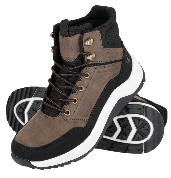 Čevlji Fuego so kakovostni gležnjarji, zasnovani za udobno in varno uporabo v različnih razmerah. Izdelani so iz trpežne kombinacije PU in Oxford materiala, ki nudi dolgo življenjsko dobo, odpornost na obrabo ter hkrati ohranja lahkotnost obutve. Višji zgornji del nudi dobro zaščito in oporo gležnju, klasično zapiranje z vezalkami pa omogoča prilagodljivo in varno prileganje. Podplat iz TPR materiala zagotavlja zanesljiv oprijem na različnih površinah, dobro odpornost ter udobno hojo skozi ves dan. Obutev je lahka, a hkrati vzdržljiva, zato je primerna tako za delo kot tudi za vsakodnevne aktivnosti ali lažje pohodniške izlete. Čevlji združujejo funkcionalnost, udobje in športno-robusten videz, ki se dobro poda različnim stilom in okoljem. Na voljo so v velikostih 39–46, v kombinaciji rjave, črne in bele barve.