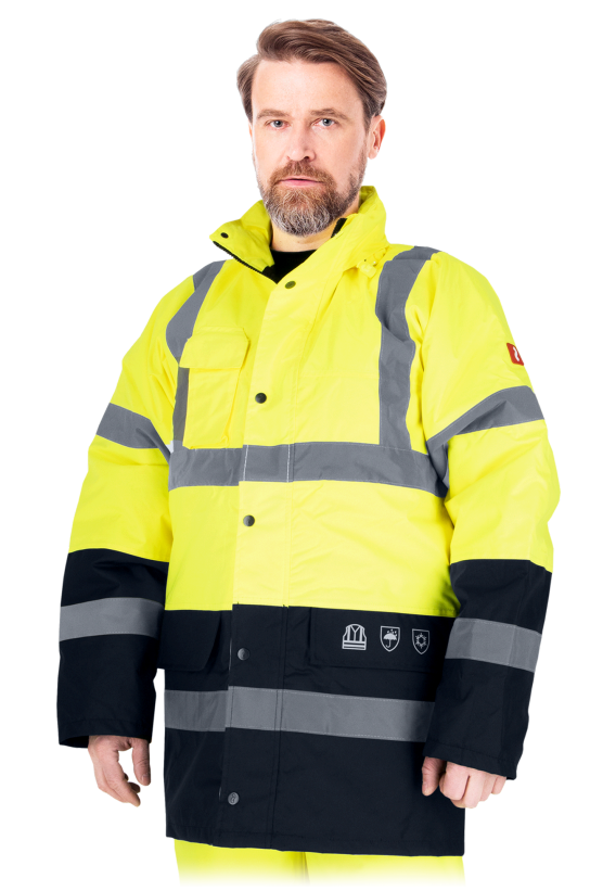 Daljša delovna zimska odsevna bunda omogoča dobro vidljivost uporabnika ter ustrezno zaščito pred mrazom, je vodo ter vetrotesna. Bunda je iz 100% poliestra (Oxford poliester), v ovratniku ima kapuco z zadrgo, je podložena s 100% Taffeta poliestrom, 160 g/m2. Ima 6 uporabnih žepov, dva žepa v spodnjem delu, žep z zadrgo v zgornjem delu, dva manjša žepa ter notranji žep. Bunda se zapenja na zadrgo ter na gumbe. Ima odsevne trakove v spodnjem delu ter na rokavih. Ustreza standardu EN ISO 20471, EN 342, EN 343 (41X). V barvah: oranžna, rumena. Zaradi zanimive barvne kombinacije je odsevna bunda zelo primerna za dobro vidljivo delo, za delo v hladnih razmerah, cestno delo, gradbeništvu, komunalno delo, transport, letalo prevozništvo, distribucijo, razna zunanja dela….