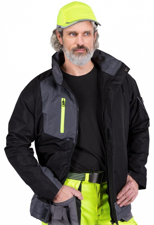 Zimska jakna je primerna za delo pri nizkih temperaturah. Je iz 100% poliestra, s PVC prevleko. Notranja podloga je iz 100% poliestra, 160 g/m2. Jakna se zapenja na zadrgo ter ježka. Z ovratnikom. Jakna ima tudi kapuco. Z več žepi (na zunanji in v notranji strani). Z elastičnimi trakovi v spodnjem delu za zaščito pred vetrom. Z odsevnimi detajli. Podložena jakna je primerna tako za profesionalno delo kot tudi za prosti čas.