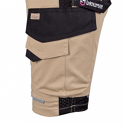 Ženske delovne kratke hlače so primerne za splošno delo, za profesionalno ali domačo rabo. So iz 97% bombaža, 3% elastana, 180 g/m2. Mrežasti dodatki so iz 80% najlona, 20% elastana, 170 g/m2. Z več žepi (dva zadaj in dva spredaj , dva pri nogah). Z elastičnim pasom za boljše prileganje. Hlače so trpežne zaradi ojačenega materiala iz Cordura. Barva: bež/črna. Primerne za tople in vroče dni. Po standardih EN ISO 13688, EN ISO 1247-2, OEKO-TEX STANDARD 100. Ženske kratke hlače so primerne za tople, vroče dni, za obrtna dela, dela v industriji, transportu, skladiščna dela in še več.